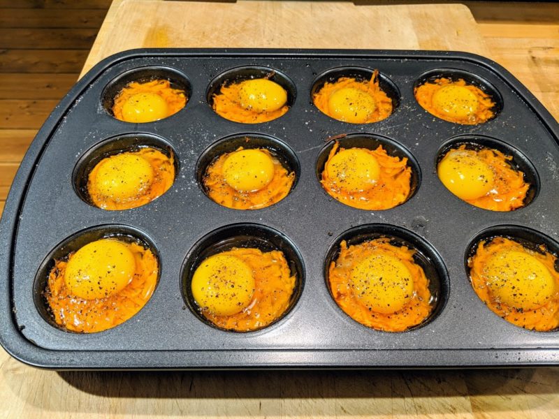 • Remove from the oven and crack an egg into each cup over the sweet potatoes.