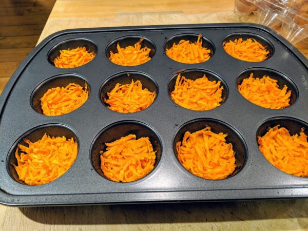 • Spoon the sweet potato into the prepared muffin pan and pressing it down  with your fingers.